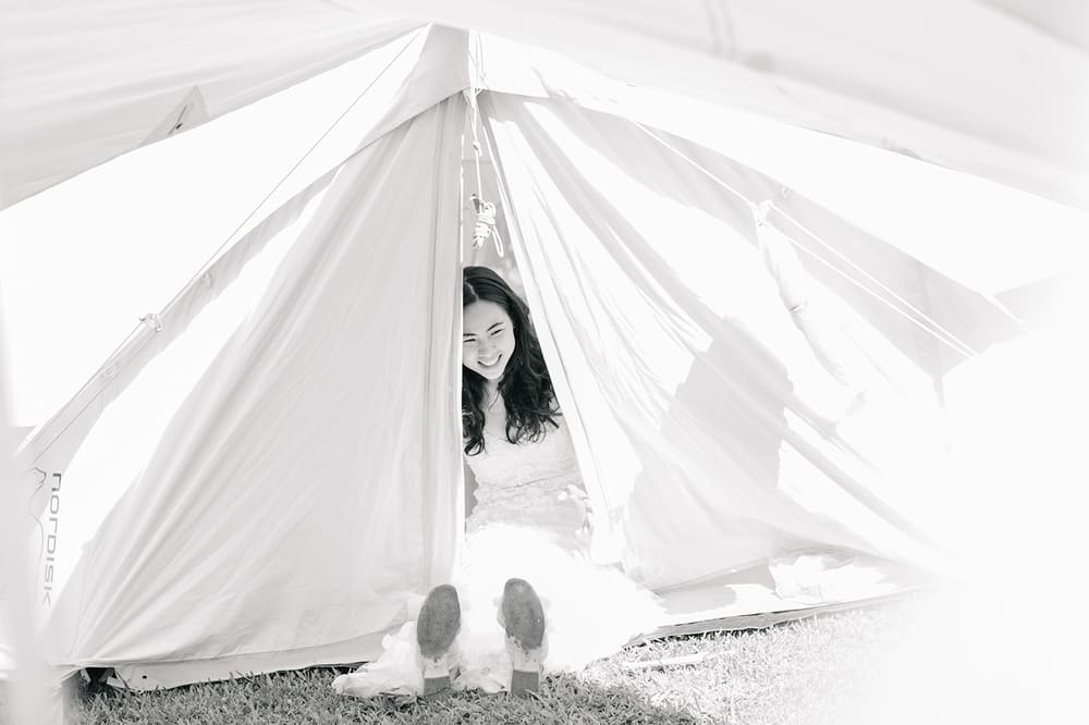 This is a self-built picnic wedding, and she is wearing no makeup – just a smile.